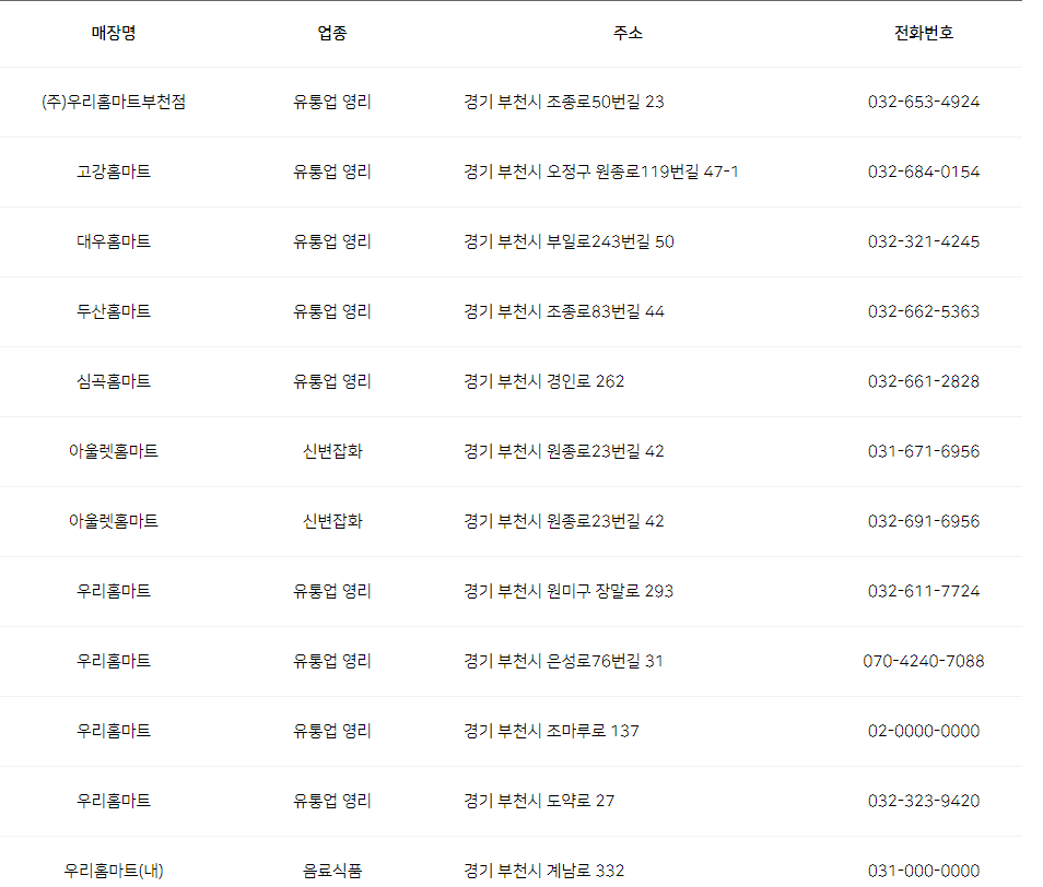 | 홈마트 | 유통업 영리 | 경기 부천시 성지로 60 | 032-682-2005 |