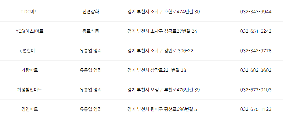 | 딱 타이 마트 | 유통업 영리 | 경기 부천시 중동로437번길 21 | 02-0000-0000 |