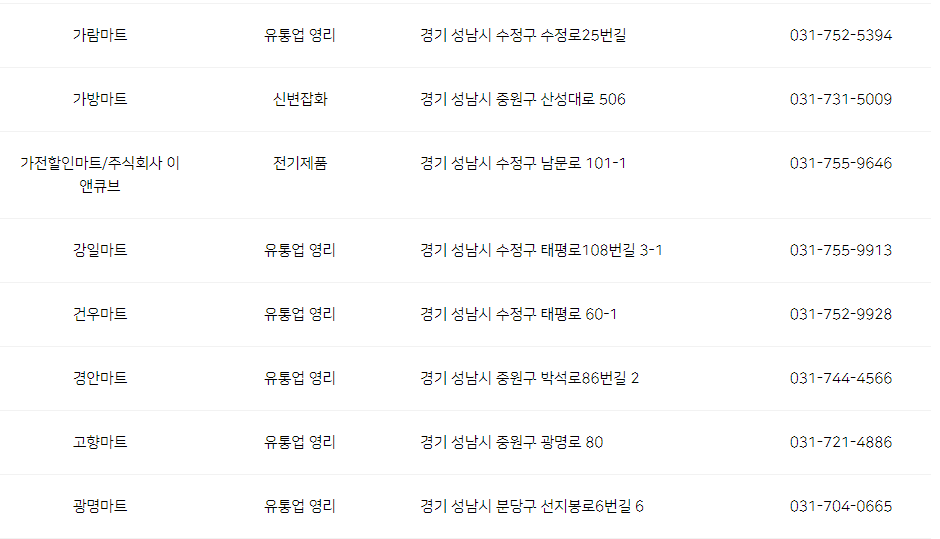 | 행운마트 | 유통업 영리 | 경기 성남시 중원구 박석로85번길 26 | 02-0000-0000 |