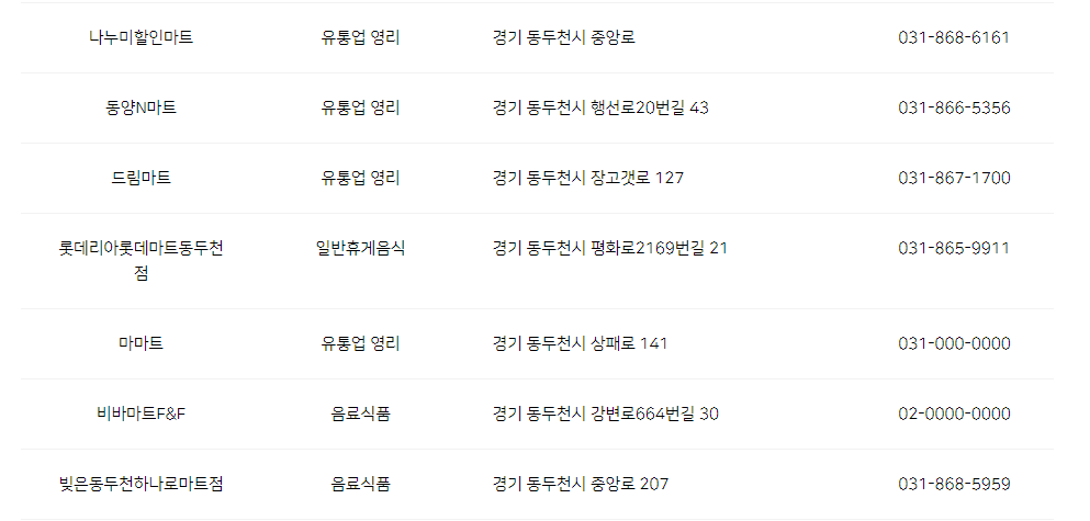 | 초원마트 | 유통업 영리 | 경기 동두천시 중앙로33번길 51-10 | 031-111-1111 |