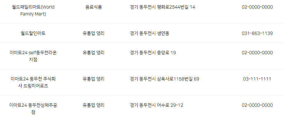 | 이마트24 동두천이담점 | 유통업 영리 | 경기 동두천시 이담로 20 | 02-0000-0000 |